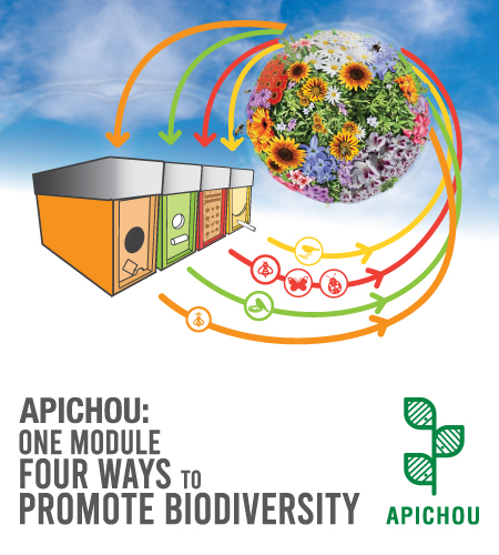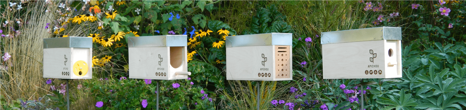 Apichou se décline en quatre modules pratiques et adaptables comprenant plusieurs possibilités d’installation et de fixation en fonction de l´espace à disposition (pré, jardin, balcon, façade). Ces modules ont été conçus spécialement pour accueillir des espèces-clés locales jouant un rôle important dans la pollinisation et la régulation des parasites telles que les coccinelles, chrysopes, oiseaux, etc.